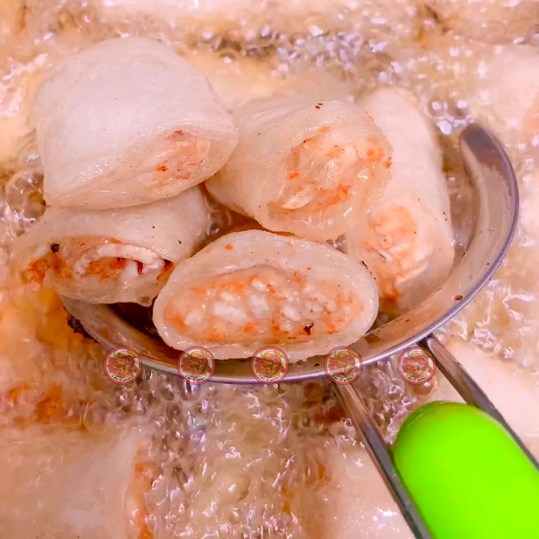 Chả Giò Tôm Tôm5Keo đã chiên sơ nhân chín. Khi dùng chiên ngập dầu ở 150–180°C trong 1-2 phút đến khi vàng giòn đều. Dùng nóng cùng bún, cơm, rau sống và nước mắm chua ngọt. Thích hợp cho mọi bữa tiệc hoặc món khai vị sang trọng.