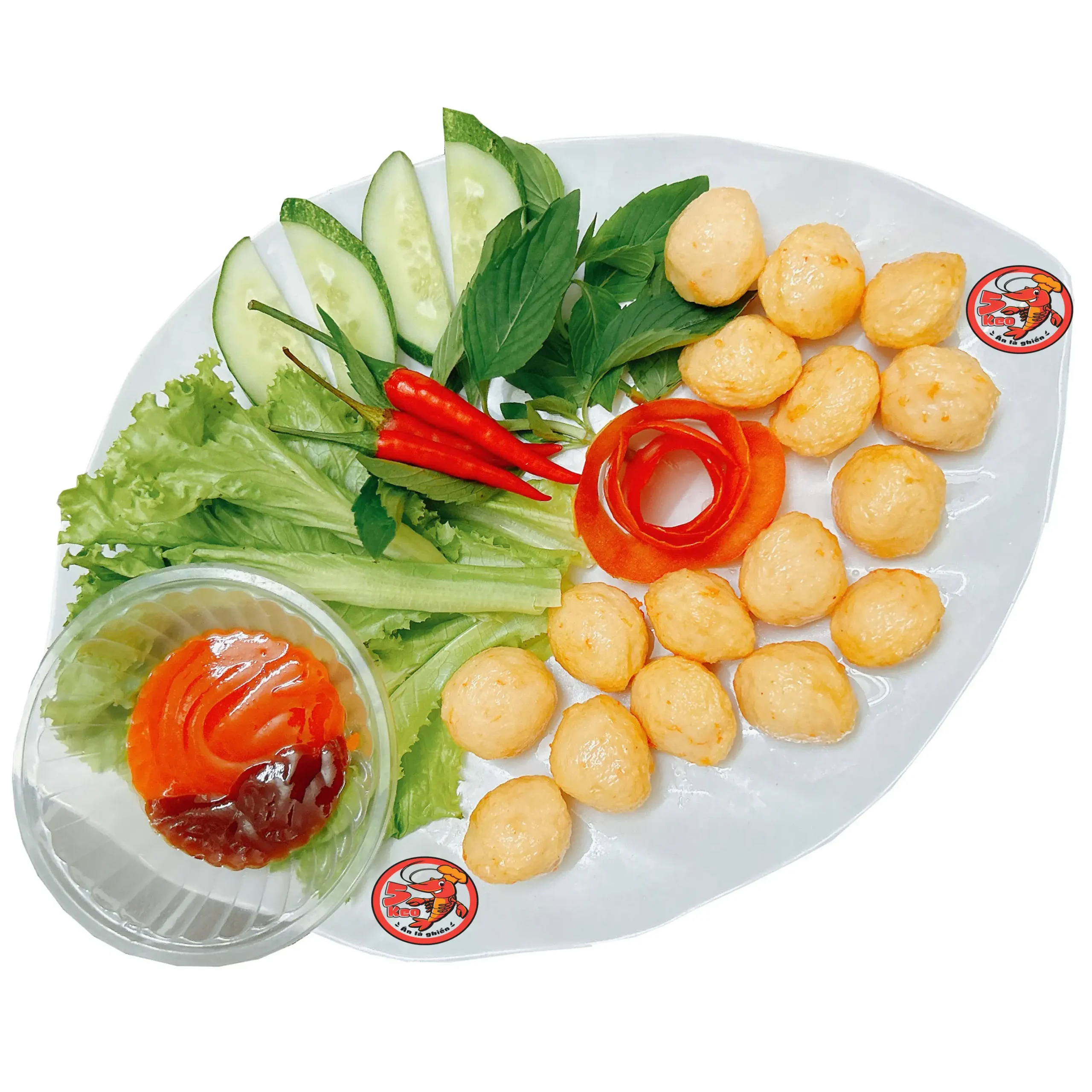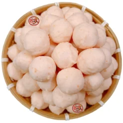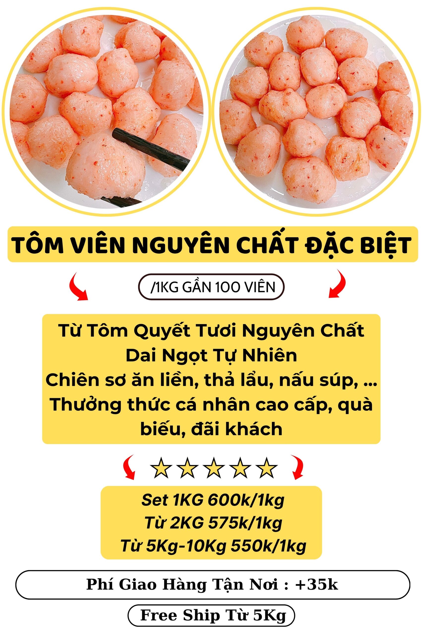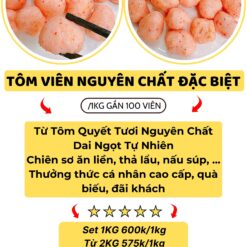 Tôm Viên Tôm5Keo được làm từ tôm tươi nguyên chất, quết kỹ thủ công cho độ dai từng sớ, thanh ngọt tự nhiên và sần sật đặc trưng. 1kg tôm viên có đến 100 viên to tròn, đóng gói hút chân không 2 túi, mỗi túi 500g. Không pha bột, không chất độn – mỗi viên đều đậm vị tôm thật, thơm ngon khác biệt.